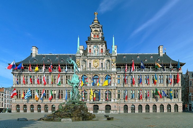 마을 회관과 수많은 길드 하우스가 있는 앤트워프의 대저택(Grote Markt)은 옛 마을의 중심입니다. 가운데에는 1887년 제프 람보(Jef Lambeaux)가 세운 화려한 브라보 분수가 서 있고, 로마의 군인 실비우스 브라보가 거인 안티고누스의 잘린 손을 셸트 안으로 집어던지는 모습이 그려져 있습니다.