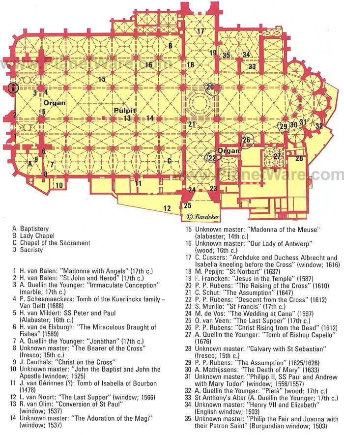 이 교회에는 루벤스, 조르다엔스, 반다이크의 그림이 소장되어 있습니다. 여기에는 장로 피터 버브루겐의 훌륭한 바로크 고백과 루벤스의 세 가지 그림이 포함됩니다. 왼쪽 통로에 있는 그리스도의 약탈 (1617)과 왼쪽 트랜셉트의 성찬식 (Shepherds and Disputation on the Bless Shepherds and Disputation on the Bless Sacrament on the Left.