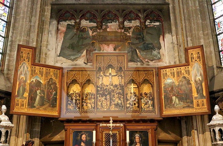 수세기에 걸쳐 대성당은 4건의 화재와 함께 극도의 분노에서 살아남았습니다. 101미터 길이의 이 실내에는 주목할 만한 가구들이 있습니다. 특히 주목할 만한 것은 아르투스 퀘민 1세가 그린 신상을 형상화한 바로크식 루드 스크린, 황금 양털 기사단의 무장으로 장식된 15세기 합창단 노점, 그리고 1731년 만든 브뤼셀 태피스트리 등입니다. 바로 오른쪽의 성당 박물관이 있는데, 이 박물관에는 값을 매길 수 없는 몇 가지 미술품들이 소장되어 있습니다.