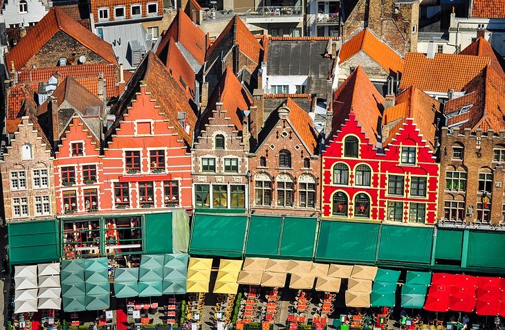 도시의 바로 중심에는 다양한 시기의 훌륭한 건물들로 사방이 둘러싸인 브뤼헤의 번화한 중심 광장이 있습니다. 동쪽은 1887년부터 서반데렌 지방 정부의 자리인 네오고티크 프로빈도 호프 건물이 지배하고 있습니다. 왼쪽 모퉁이를 차지하고 있는 서쪽에는 15세기 후이스 보우슈테의 매력적인 벽돌이 있습니다.
