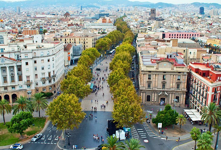 여름 저녁에 람블라 거리를 거닐다 보면 바르셀로나의 모든 주민이 그곳에 함께 있다고 생각할 수 있습니다. 그것은 확실히 여름 저녁이나 주말에 퇴근 후 장소입니다. 가로수가 늘어선 이 대로는 항구 근처의 콜럼버스 기념관에서 북서쪽으로 뻗어 있는 도심을 가로지르는 녹색 선(아주 직선이 아닌)을 자릅니다.