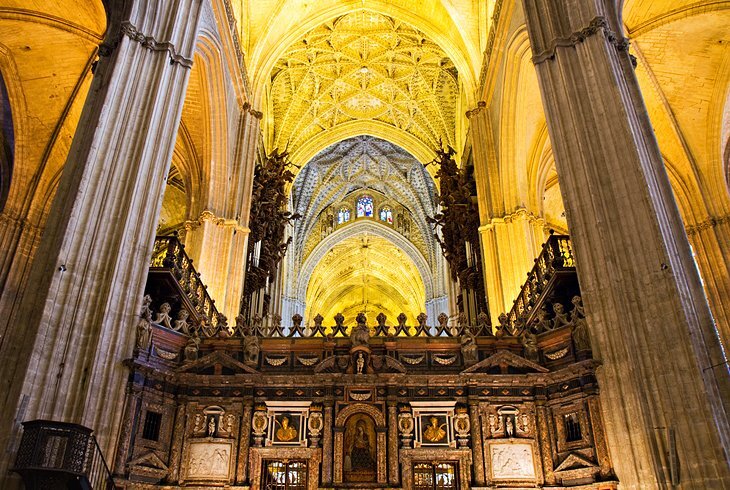 크리스토퍼 콜럼버스의 기념비적인 무덤은 실물보다 더 큰 인물 4중주가 높이 높이 솟아 있습니다. 세비야의 상징인 히랄다는 첨탑으로 시작하여 대성당을 짓기 위해 파괴된 도시의 대모스크에 남아 있는 전부입니다.