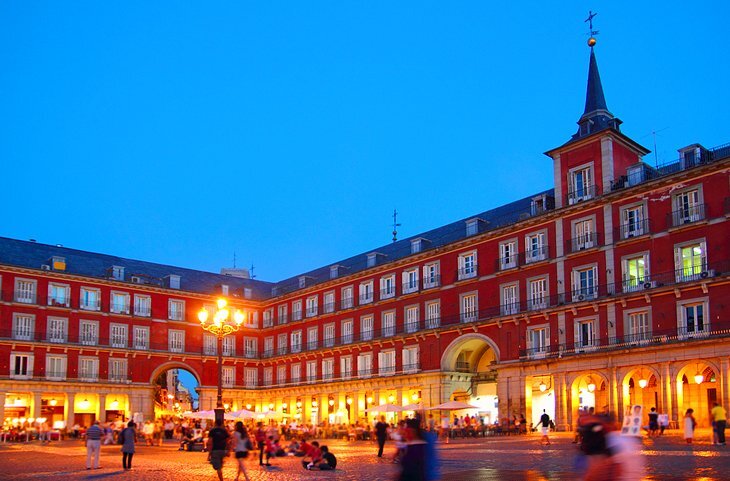 이곳은 새 왕의 선포, 성인의 시성, 이단자의 화형과 같은 의식 행사와 기사도 대회 및 투우와 같은 대중 오락의 무대로 사용되었습니다. 보행자 전용 석재 포장 도로에 뻗어있는 카페와 아케이드 아래 그늘진 레스토랑은 마드리드의 거실이며 Madrileños와 관광객 모두에게 인기있는 만남의 장소입니다.