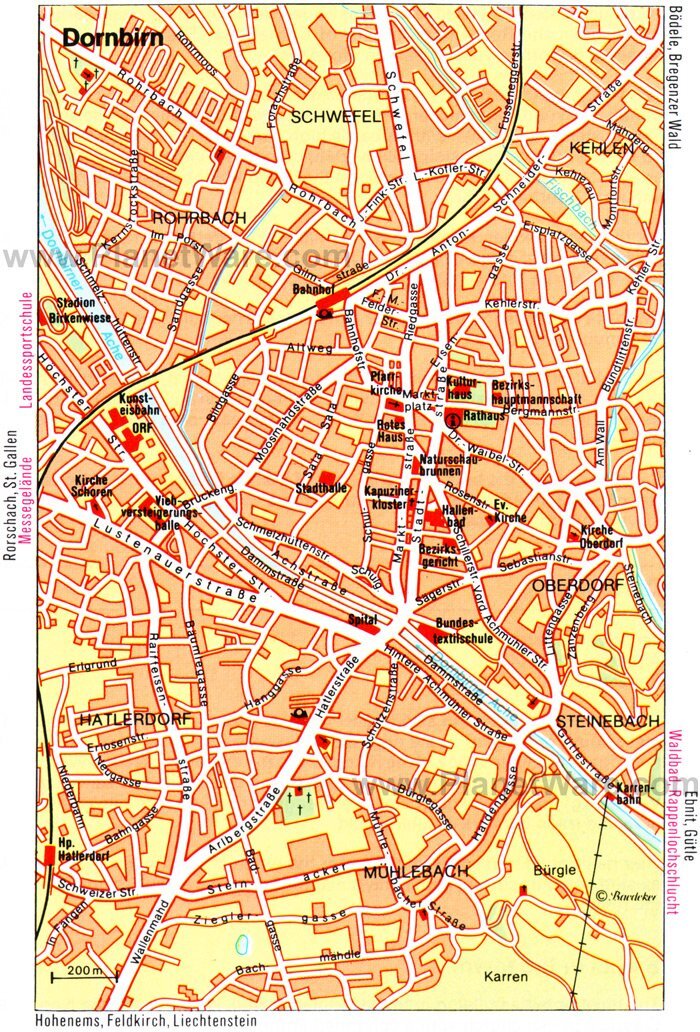 Vorarlberg 주에서 가장 새롭고 가장 큰 도시인 Dornbirn은 Bregenz에서 남쪽으로 불과 몇 킬로미터 떨어진 Bregenzerwald 가장자리에 있습니다. 이 도시는 많은 섬유 회사로 잘 알려져 있으며 정통한 쇼핑객은 회사 매장을 방문하여 할인을 받을 수 있습니다. AD 895년 기록에 처음 언급된 Dornbirn은 1901년 이후로 현재 이름으로 존재했으며 지금은 라인강까지 확장되었습니다.