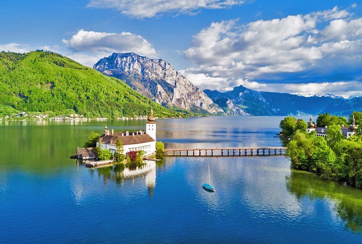 호수에는 작은 섬에 지어진 중세 요새인 슐로스 오르트(Schloss Ort)가 있습니다. 긴 다리로 접근할 수 있고 잘 손질된 작은 정원으로 둘러싸인 이 요새는 Traunsee가 가장 좋아하는 엽서 이미지입니다.