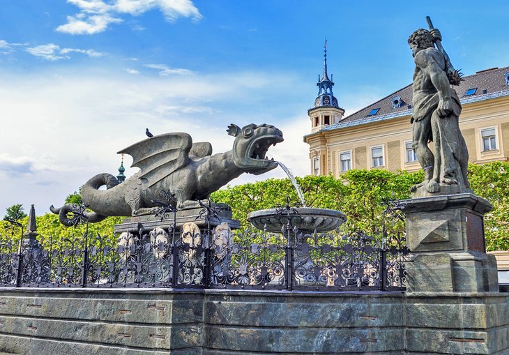 Neuer Platz 는 Lindwurmbrunnen ( 용 분수 )이 있는 아름답고 넓은 광장인 도시의 새로운 지역 중심입니다. 이 장엄한 조각품에는 도시가 건설된 늪에 서식했다고 전해지는 거대한 용인 도시의 상징이 있습니다.