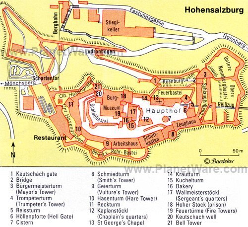 요새로 가는 길은 17세기 Fire Bastion 아래에 있는 인상적인 아치형 방어 관문을 지나 Reisszug까지 이어집니다. 이 호이스트는 한때 보급품을 운반하는 데 사용되었던 1504년에 지어진 독특한 호이스트입니다. 말 문을 통해 1539년에 만들어진 고대 라임 나무와 수조가 있는 Haupthof(외부 와드)로 계속 이어집니다.