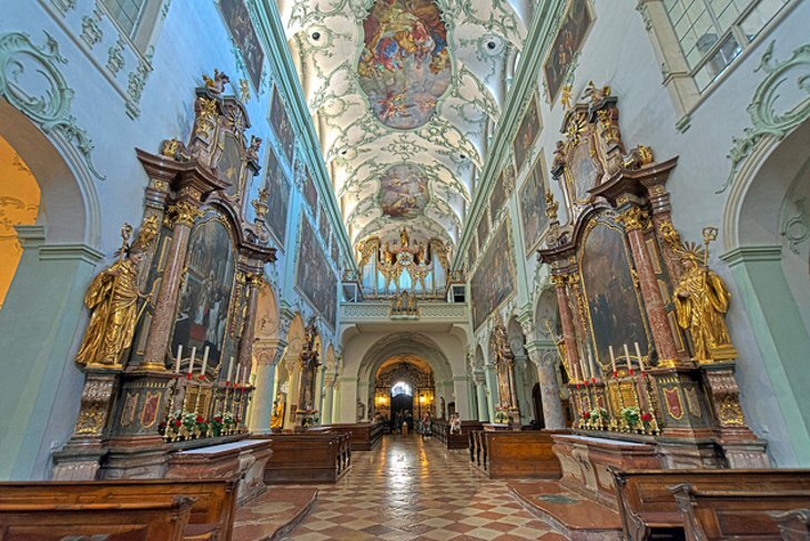 통로는 교회 마당에서 1673년에 지어진 성 베드로 분수(Petrusbrunnen)로 장식된 외부 안뜰로 이어집니다. 또한 유명한 작곡가 Joseph Haydn의 형제인 Johann Michael Haydn의 삶과 작품을 묘사한 Haydn 기념관 도 주목해야 합니다.