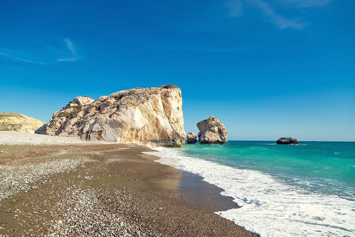 해변에서 바로 앞바다에 페트라 투 로미우(영어로는 아프로디테 락으로 알려져 있다)의 들쭉날쭉한 바위들이 자리잡고 있습니다. 현지 전설에 따르면 이곳은 그리스 여신 아프로디테가 처음 바다에서 나타난 곳입니다.